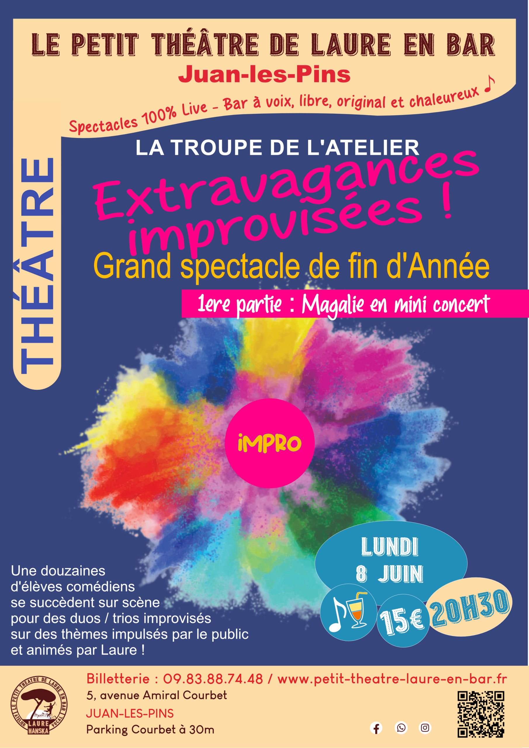 Le grand spectacle de fin d’année des élèves de théâtre prend place ! Le résultat d’une année remplie de progrès et de lâcher-prise promet un beau moment d’humanité et de talent. Un concert de la sublime Magalie aura lieu en première partie. Venez les soutenir !