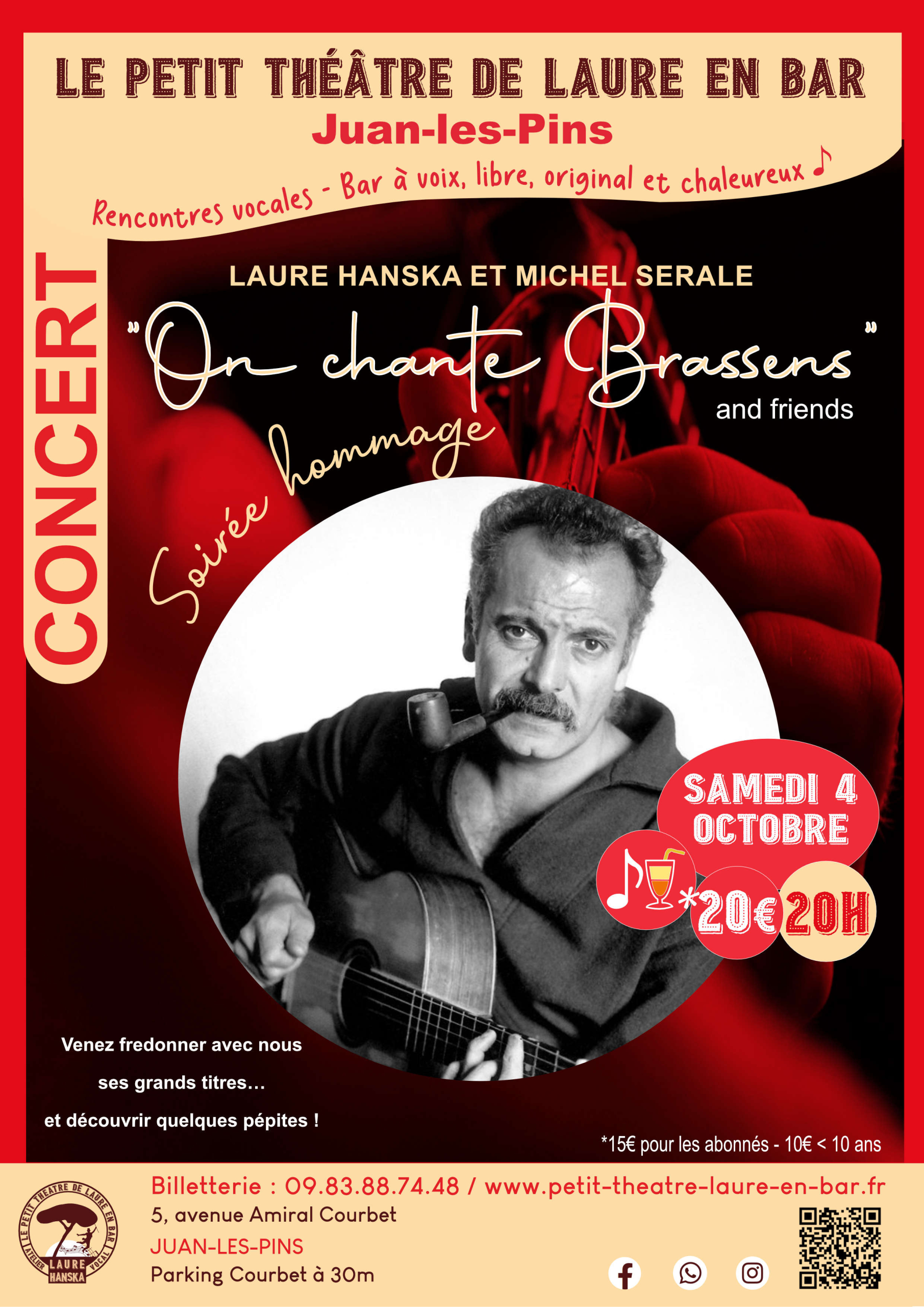 Autour de Michel Serale et de son groupe, plusieurs artistes rendent hommage à la créativité et aux talents de mélodiste et de parolier de Georges Brassens. Venez prendre part à leur hommage à cet artiste aimé de tous et fredonner avec nous ses grands titres… et découvrir quelques pépites !